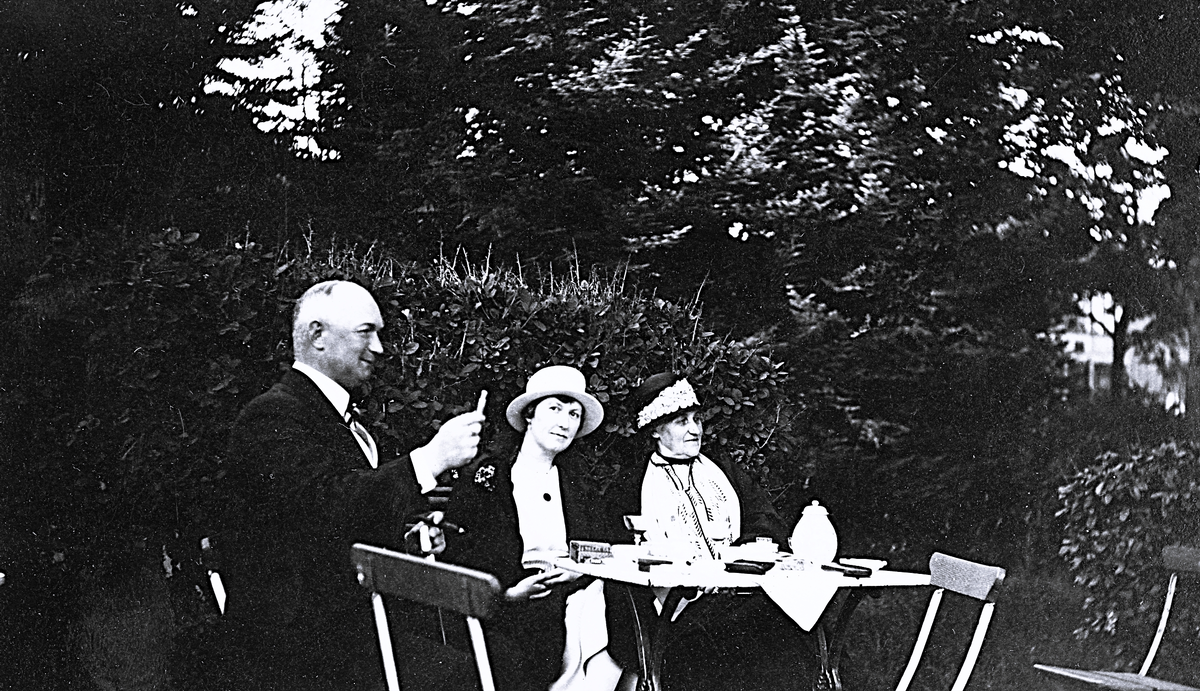En man och två kvinnor sitter utomhus och tar en fika i Älvkarleby. Text i album: "Elfkarleö 1926".