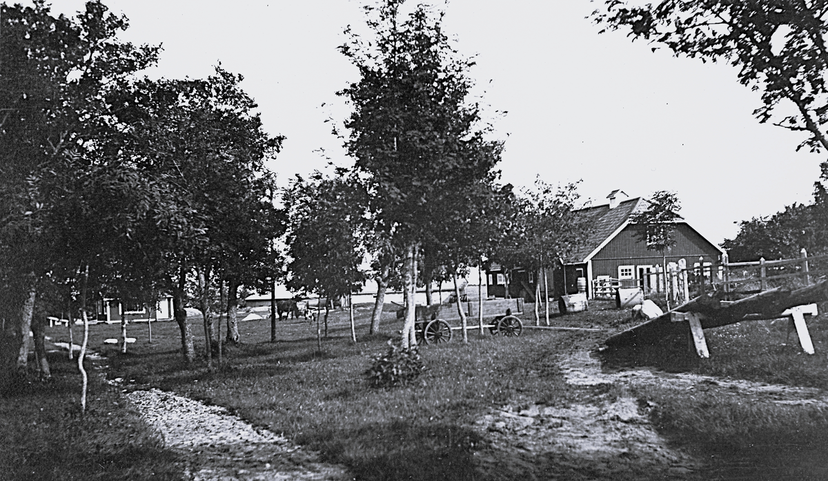 En gårdstomt med två byggnader och många träd samt en stig som leder till husen. Man kan även skönja havet i bakgrunden. Text i album: "Marö, 1924".