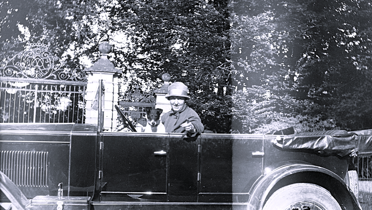 En kvinna och hund som sitter i en bil framför en grind med träd i bakgrunden. Text i album: "Hemfärd via Löfsta".