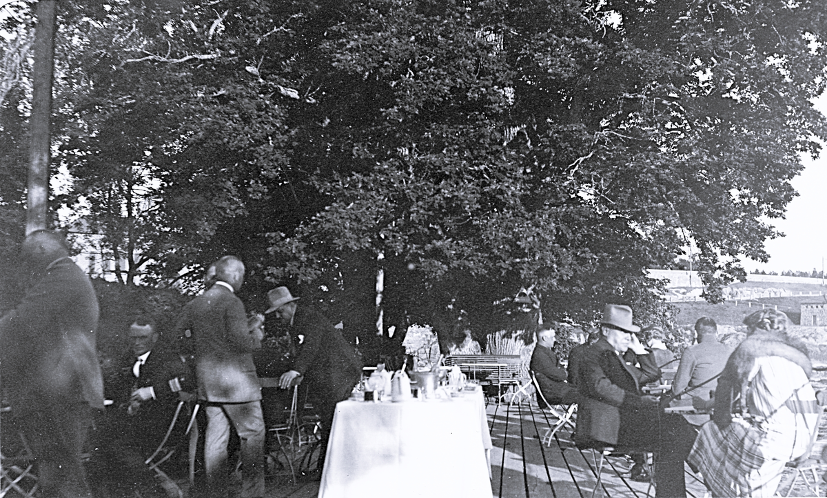 En grupp män med uniformer som sitter och samtalar. Text i album: "Middag för tyska sjöofficerare å Elfkarleö, sommaren 1926".