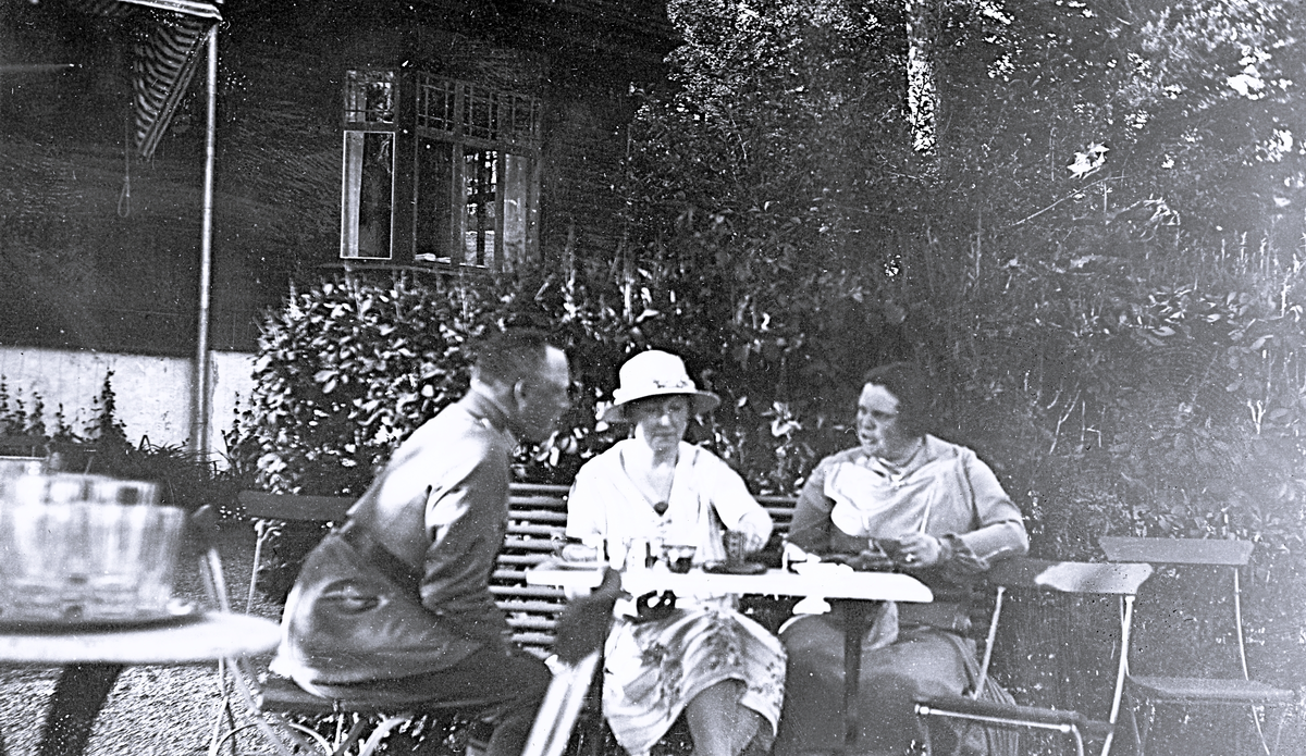 Män och kvinnor som sitter utomhus och dricker kaffe vid turisthotellet i Älvkarleby i bakgrunden. Text i album: "Middag å Elfkarleö 1926".