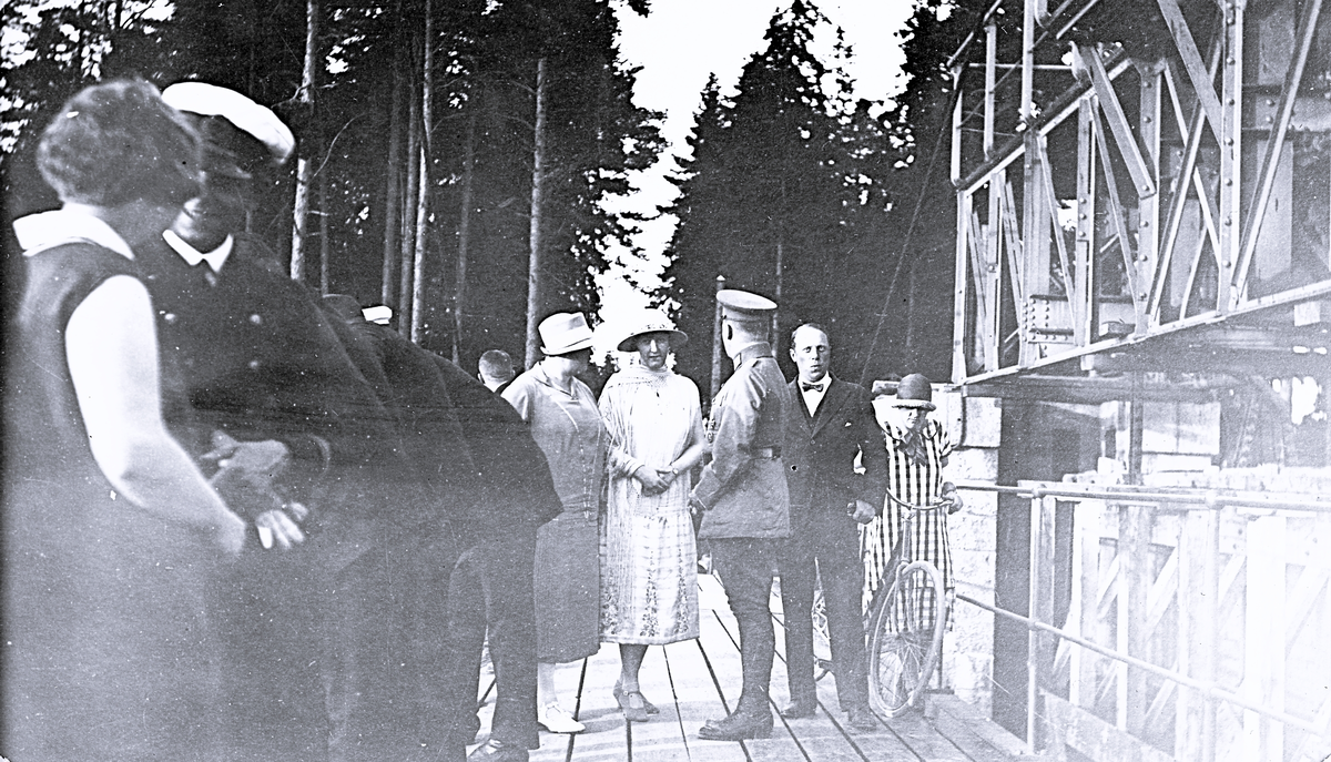 En grupp män och kvinnor umgås efter en middag, stående på en träbro i Älvkarleby. Text i album: "Efter middagen å Elfkarleö 1926".