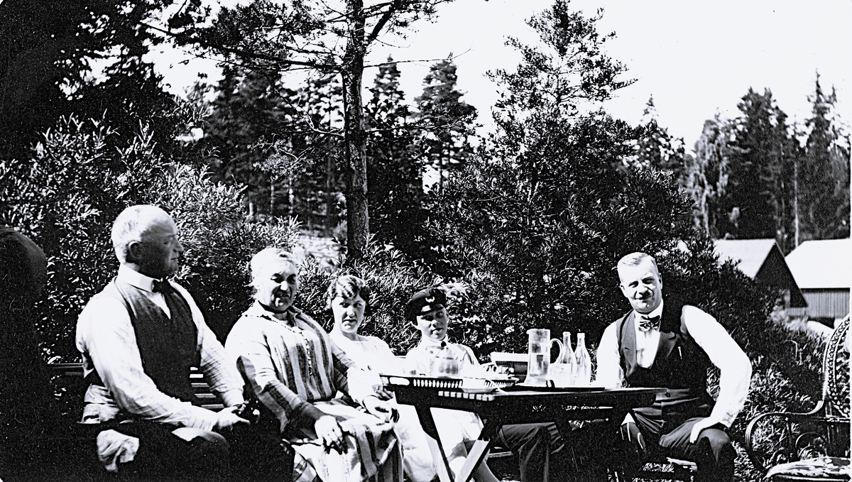 En grupp människor som sitter utomhus i en trädgård och fikar, man skönjer en skog och några byggnader i bakgrunden. Text i album: "Furuvik, 1925".
