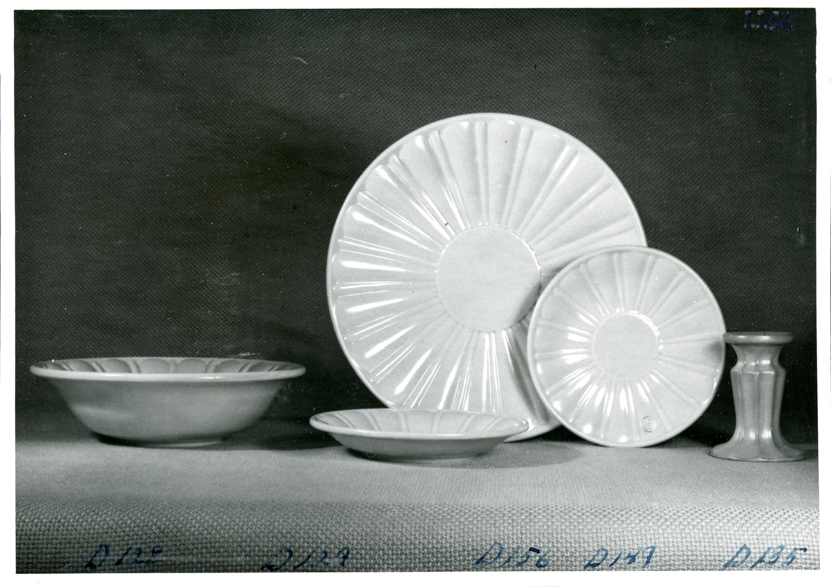 Fat, assietter samt ljusstake från Bo Fajans, formgivare Ewald Dahlskog, 1900-talets mitt.