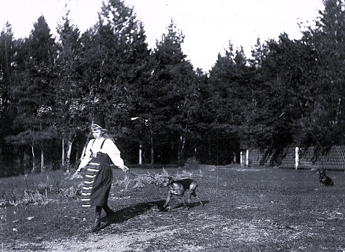Foto av Ingrid med folkdräkt på promenad med hund, Gröndal. Bildtext i album: "Så plan _1897".