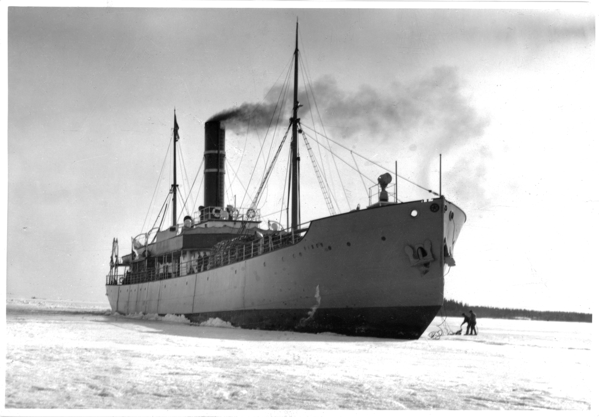 Ångfartyg fast i isarna utanför Gävle. Vid fören står två personer och sysslar med linor. På däck syns en stor hög med ved.