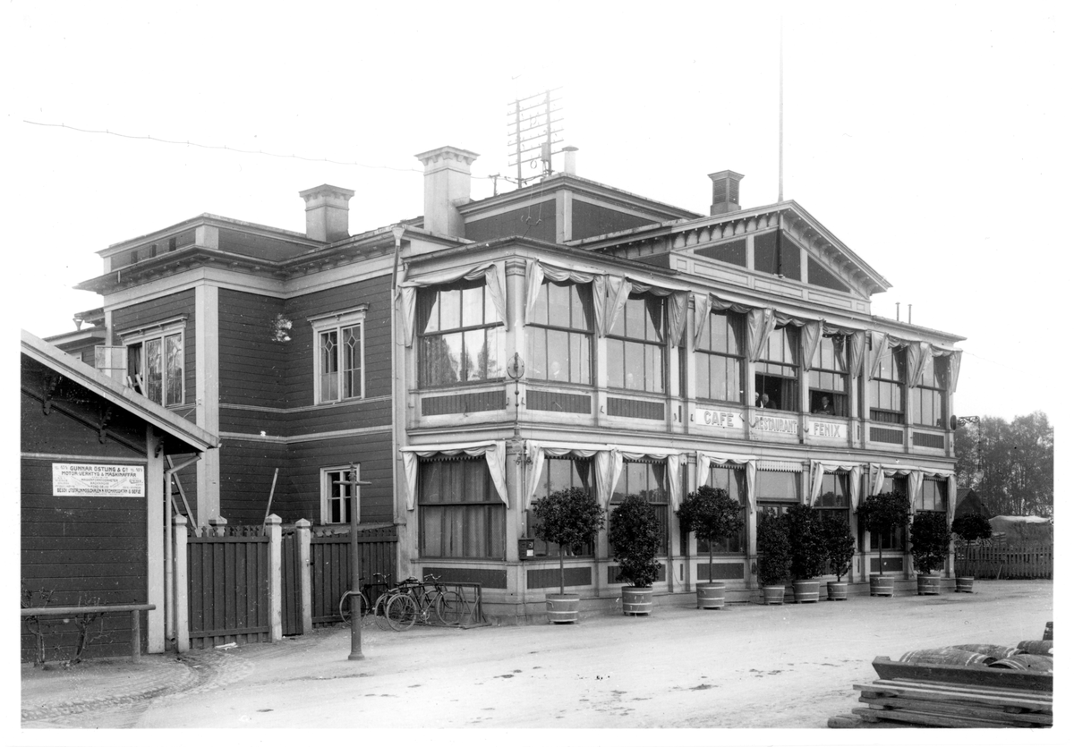 Exteriörbild av "Fenix", ett tidigare hotell och resturang på Alderholmen. På skylten går att läsa "Cafe Resturant Fenix". Till vänster i bild syns en skylt med texten "Gunnar Östling & Co - Motorer- Verktyg & Maskinaffär".