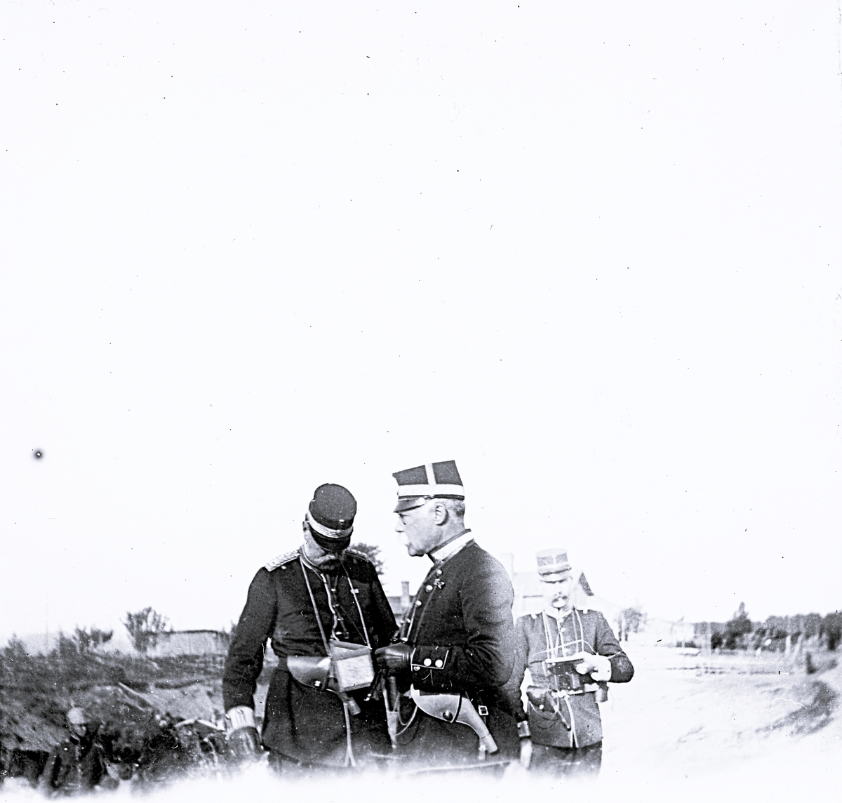 Foto av militärer som är ute på fältövningar en lantlig bakgrund. Text i album: "Fr v. Tauvon, Warberg och Lagerlöf".