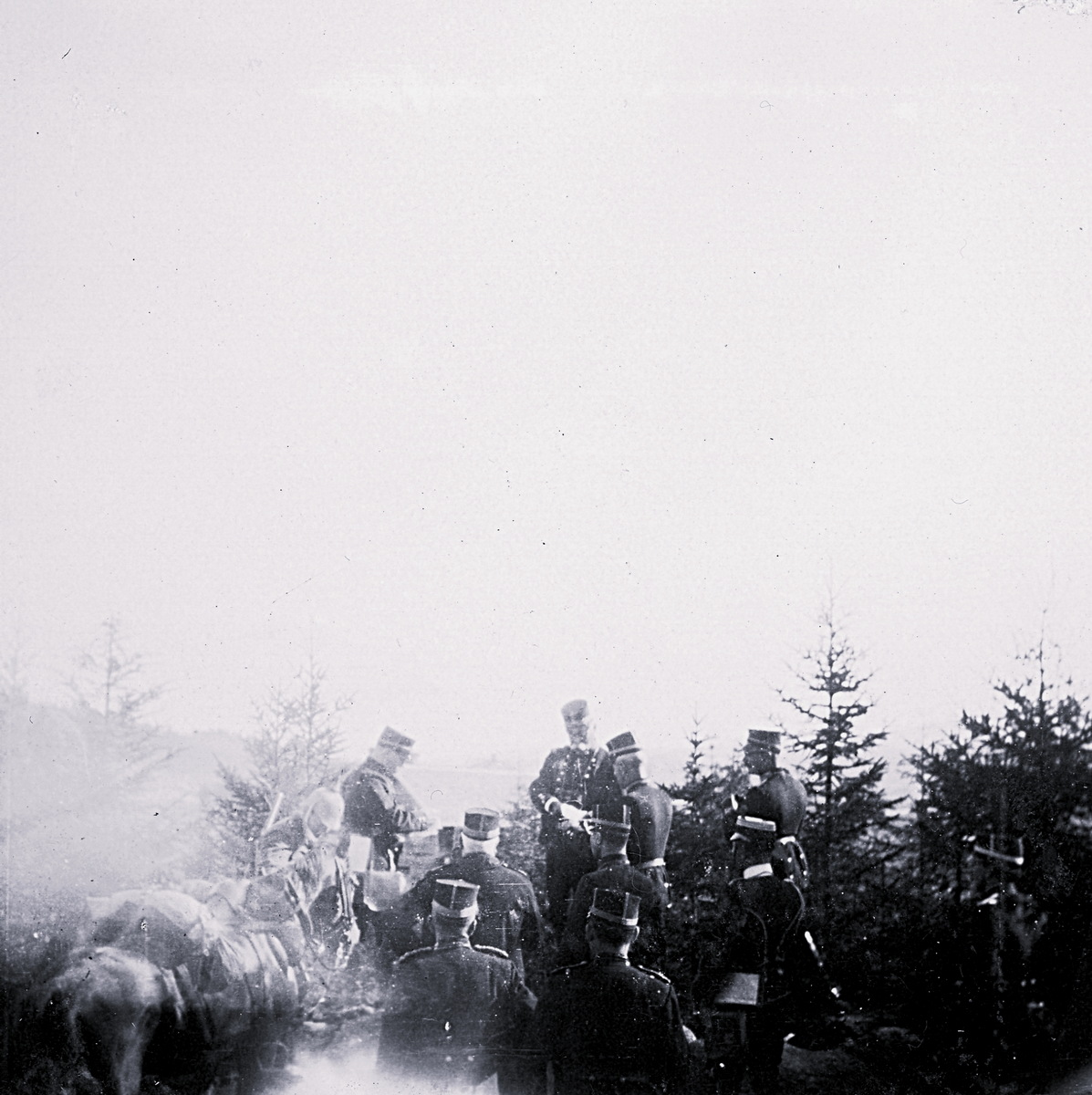 Foto av militärer ute på fältövningar, en häst syns till vänster i bild. Text i album: "Fr v. Lilliehöök, Aspgren, Selander, Warberg, Leijonhufvud, Forsgren, Sundin, Bäckström, Petré och Engström".