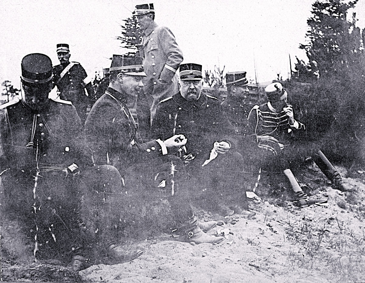 Foto av en grupp militärer som tar en fikapaus från fältövningarna. Text i album: "Fr v. Säfvenberg, Sandberg, Leijonhufvud, Tham, Selander och Bäckström".