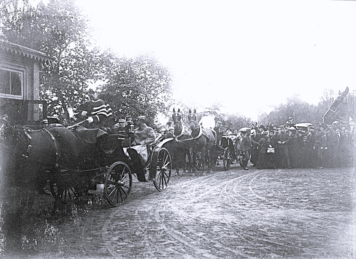 Foto av en grupp människor och hästdragna vagnar, troligen sitter det några kända personer i vagnarna.