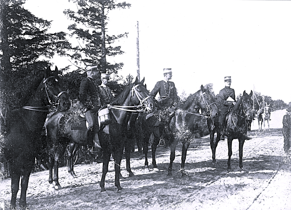 Foto av en grupp militärer till häst som är ute på fältövning. Text i album: "Fr v. Mörcke, Ribbing, Prins Carl och Lyström".