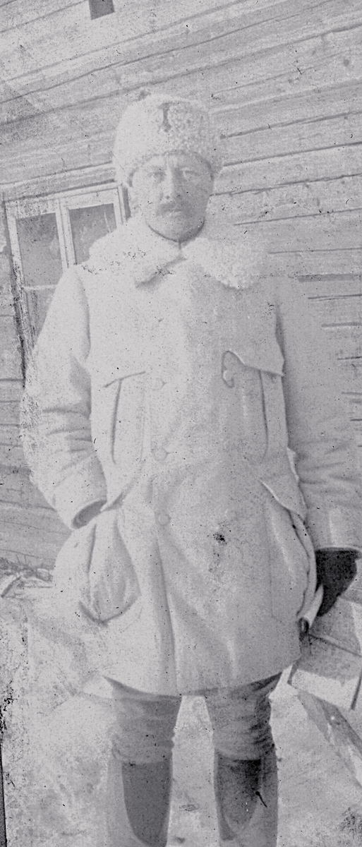 Foto av en militär i vinterkläder, i bakgrunden syns en husvägg, under arméfördelningens fältövningar 1905. Text i album: "Ryttm. Adlercreutz K.8".