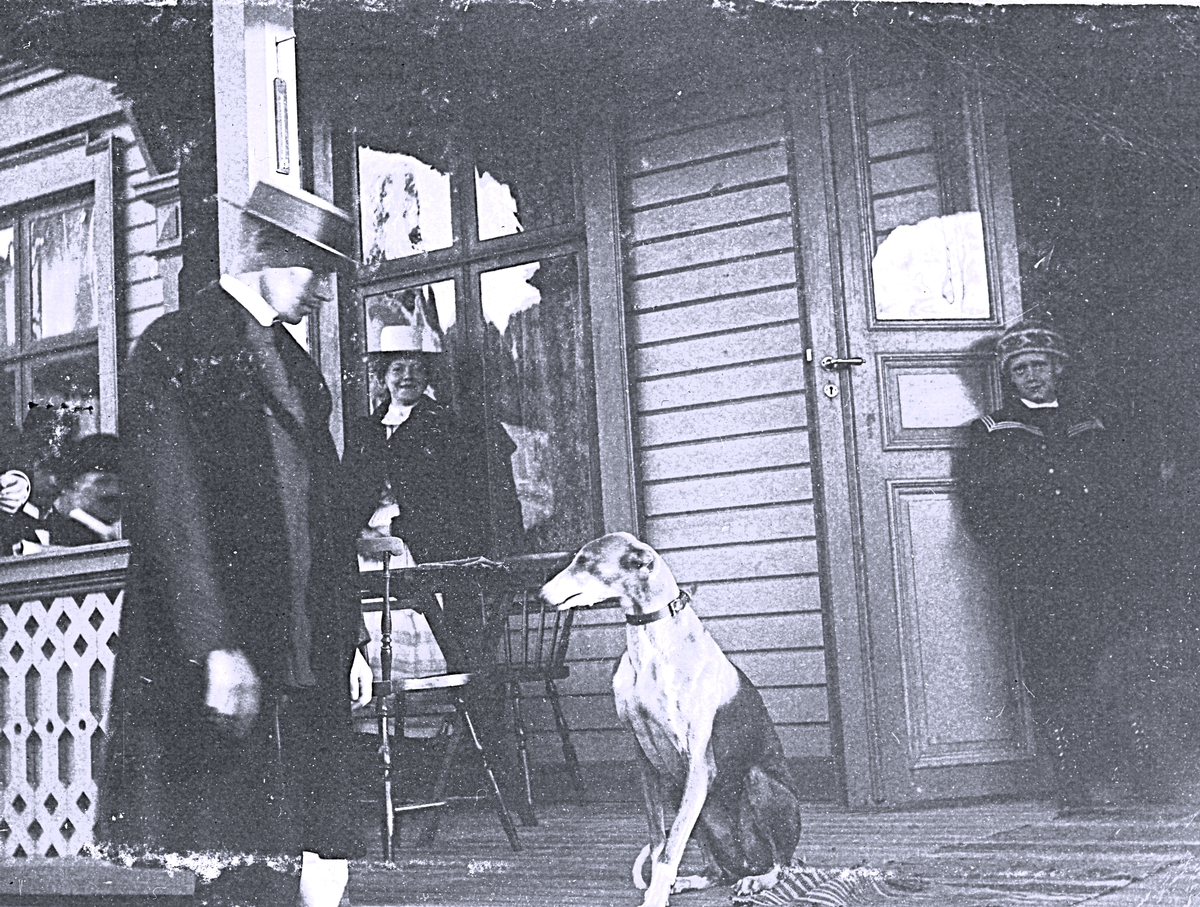 Titel: Foto av en hund, troligtvis en greyhound eller liknande, samt en kvinna, barn och en man på en veranda.
