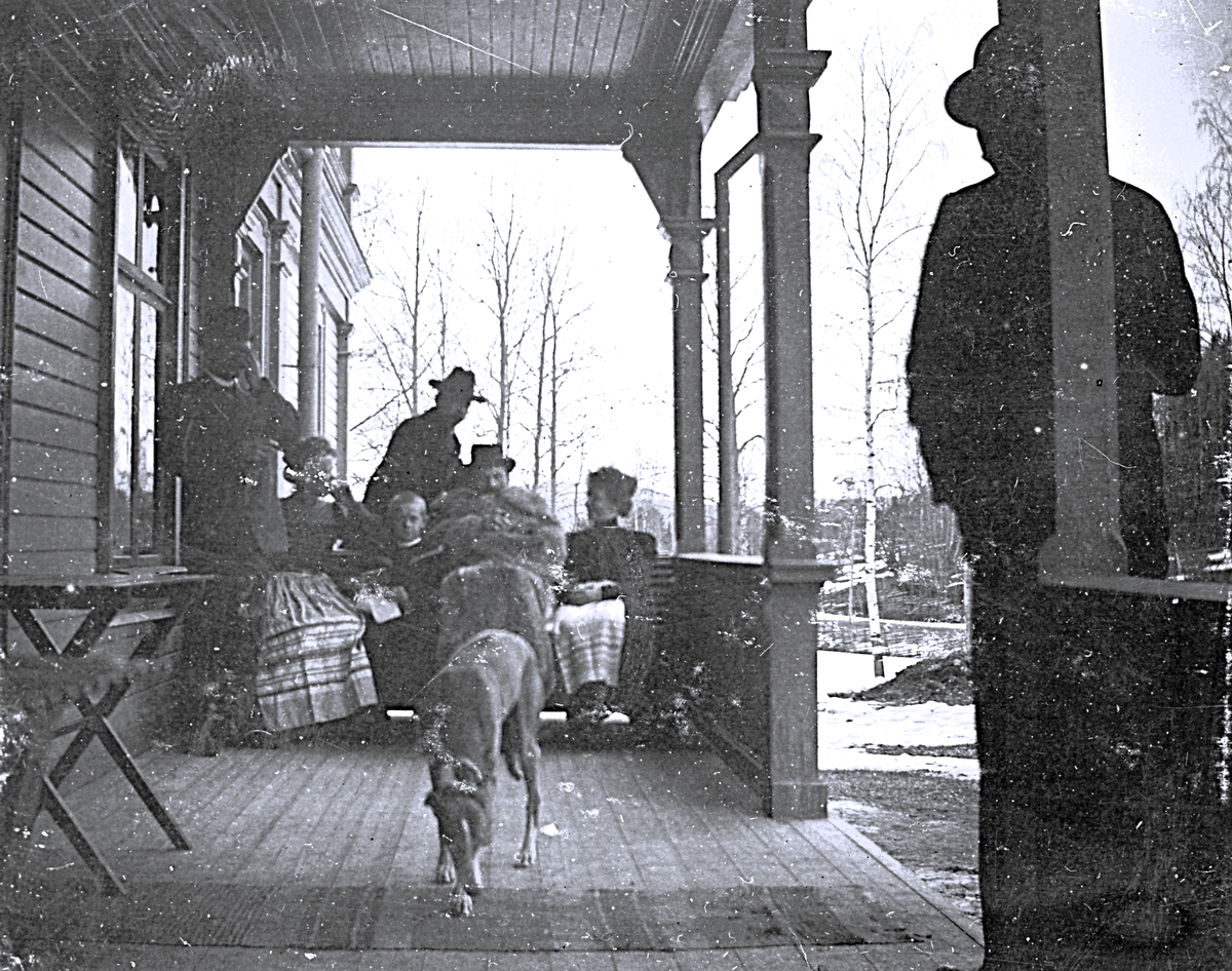 Foto av män och kvinnor samt en hund som sitter på verandan till Borgsjö prästgård.