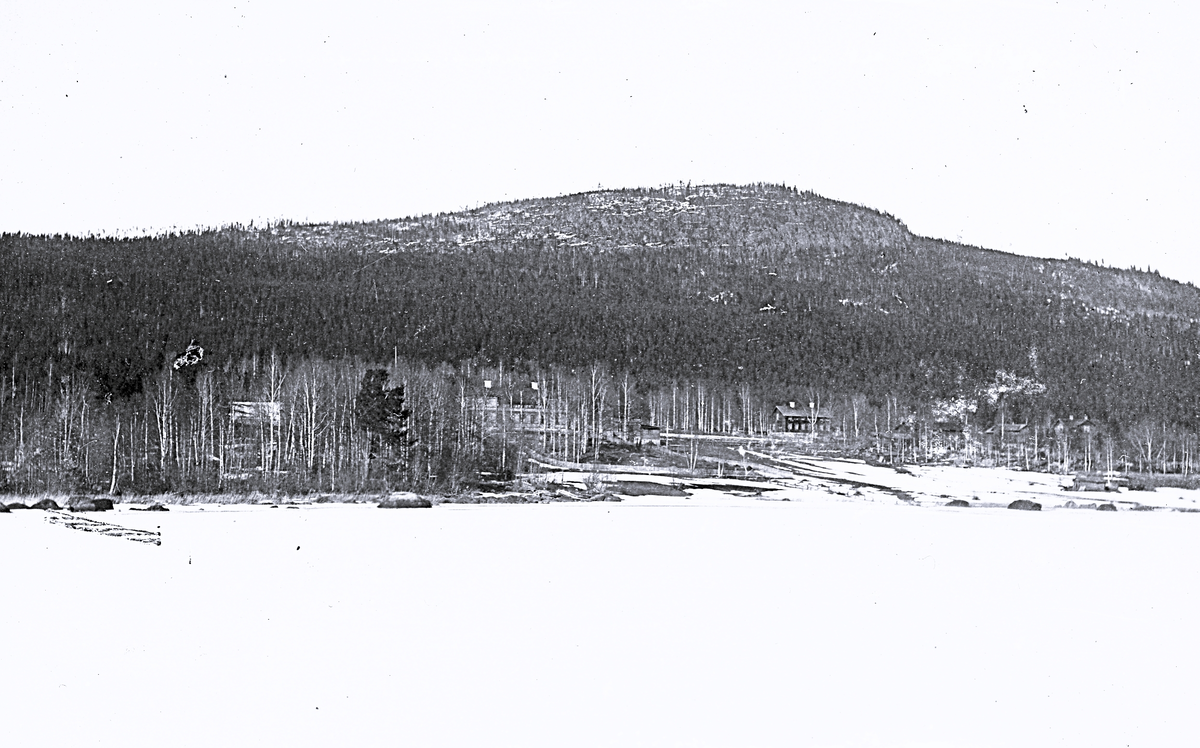 En vintervy över ett bergigt landskap med några bostäder bakom träden.