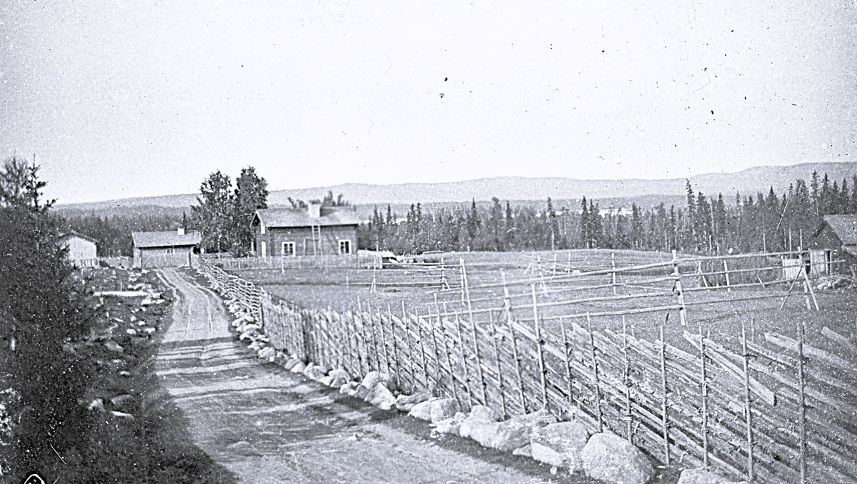 Foto av ett landskap med en väg, en gärdsgård och en byggnad i bakgrunden.
