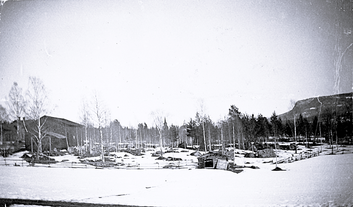 Titel: Foto av ett snötäckt landskap med några byggnader som syns bakom träden till vänster och en bergssluttning till höger.
