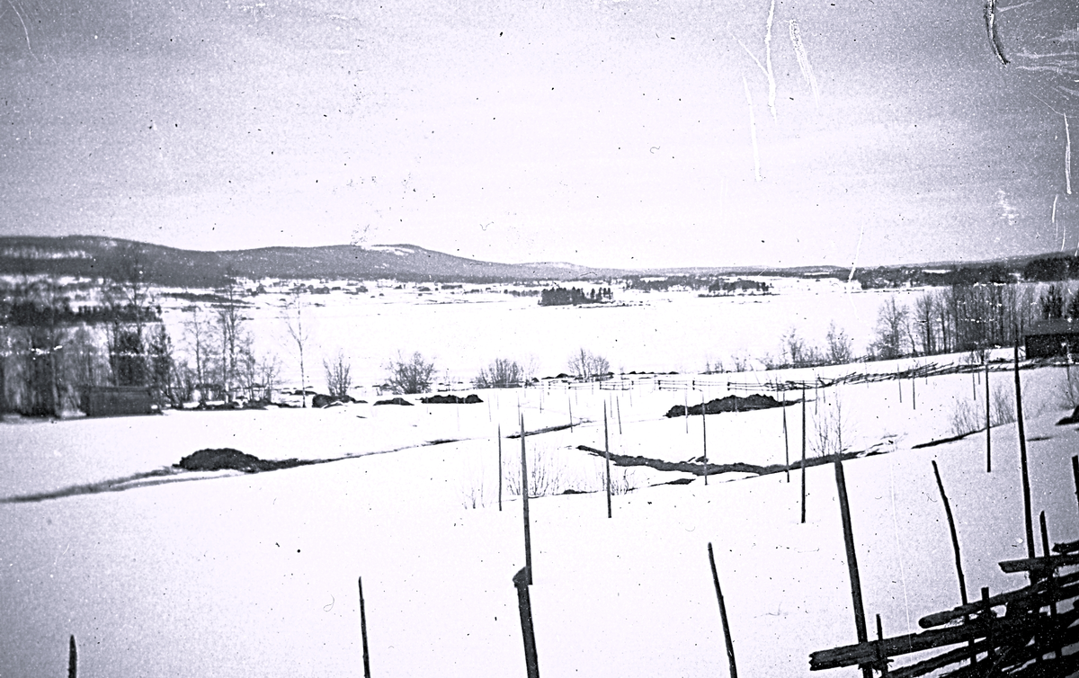 Titel: Foto av ett snötäckt landskap där man skymtar berg i bakgrunden, någonstans i norra delen av Sverige.