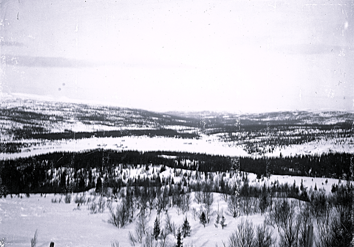 Foto av ett snötäckt landskap där man skymtar berg i bakgrunden. Text i album: "Merakerdalen från riksgränsen, 1902".