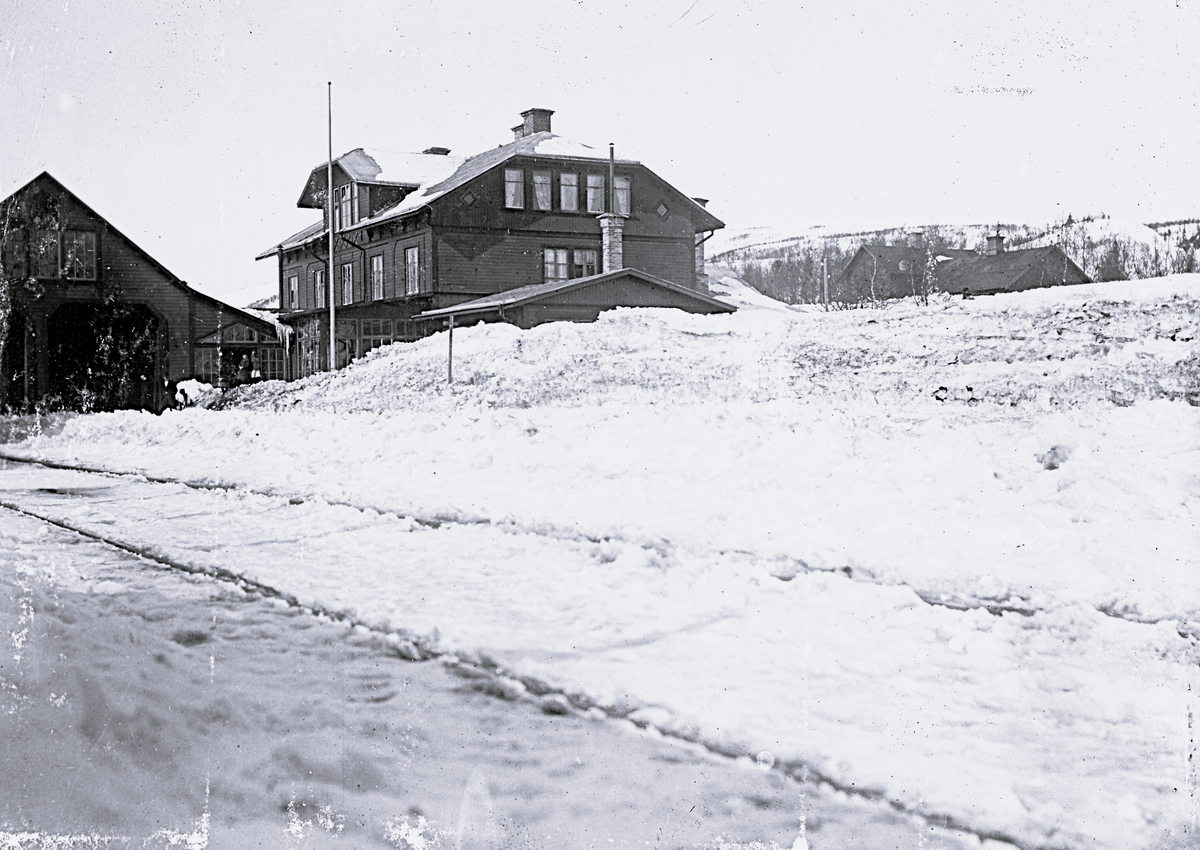 Foto av en snötäckt väg med Storliens järnvägshotell i bakgrunden. Text i album: "Storlien".
