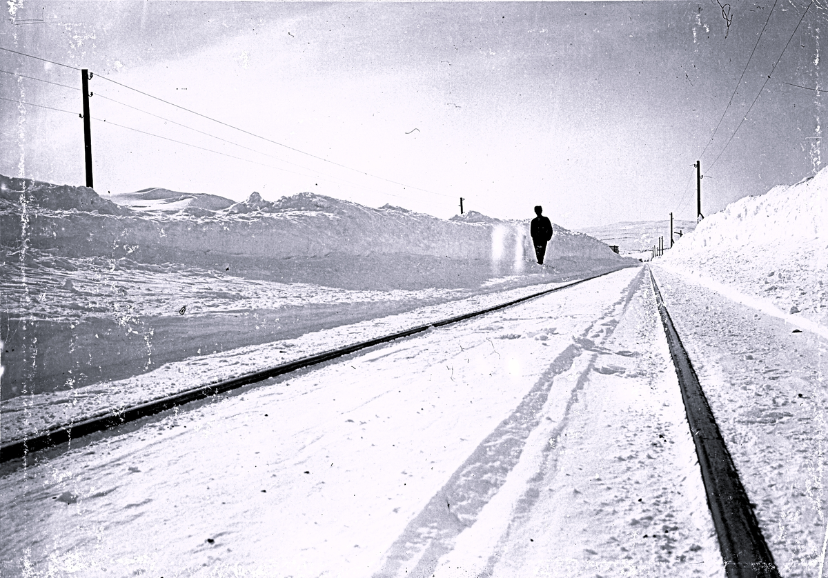 Foto av ett snötäckt järnvägsspår med en man som står vid spåret samt att man kan skönja berg i bakgrunden.