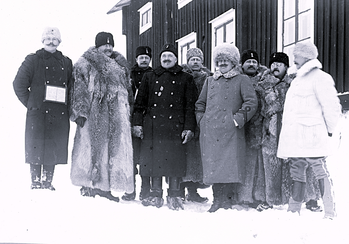 Titel: Foto av påpälsade militärer under arméfördelningens fältövningar 1905. Text i album: "Kåren A. Fr v. Duse, Michelson, Säfvenberg, Sundelius, Hjertström, Björkman, Huss, Arpi och Adlercreutz".