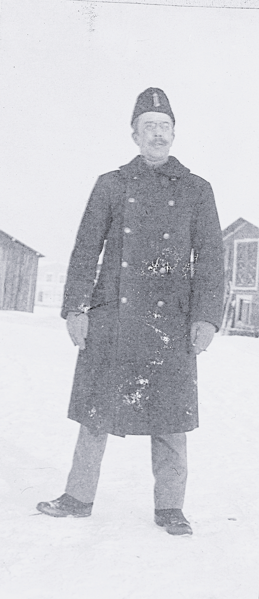 Titel: Foto av en militär med rock och mössa under arméfördelningens fältövningar 1905. Text i album: "Kapten Svedelius".