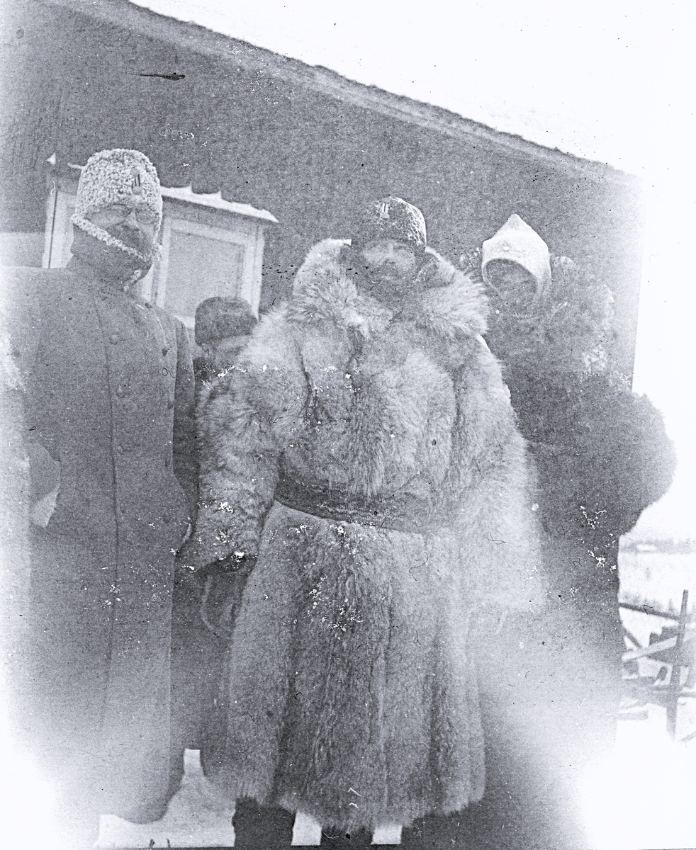 Foto av påpälsade militärer under arméfördelningens fältövningar 1905, i bakgrunden syns en byggnad. Text i album:" Mörcke, Aschan och Stålhane".