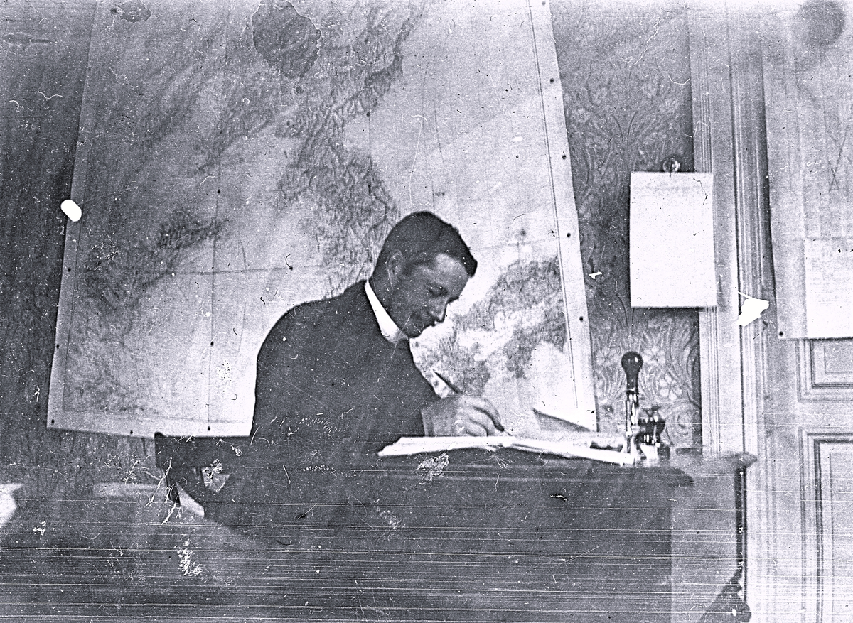 Foto av en man som sitter vid ett skrivbord, på väggen sitter en karta. Text i album: "Vid A.4 1904".