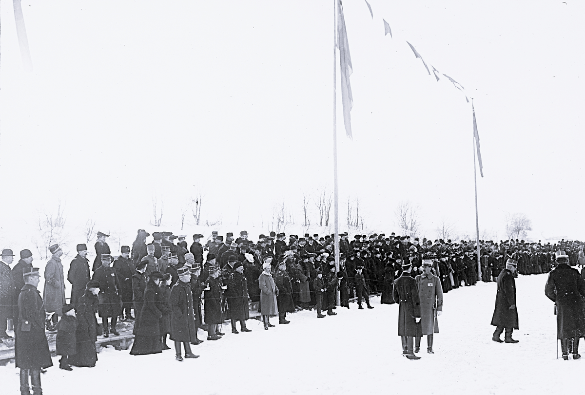 Foto av en folksamling som beskådar ett evenemang, däribland syns en del militärer. Text i album:" Kapplöpningar i Umeå 1905".