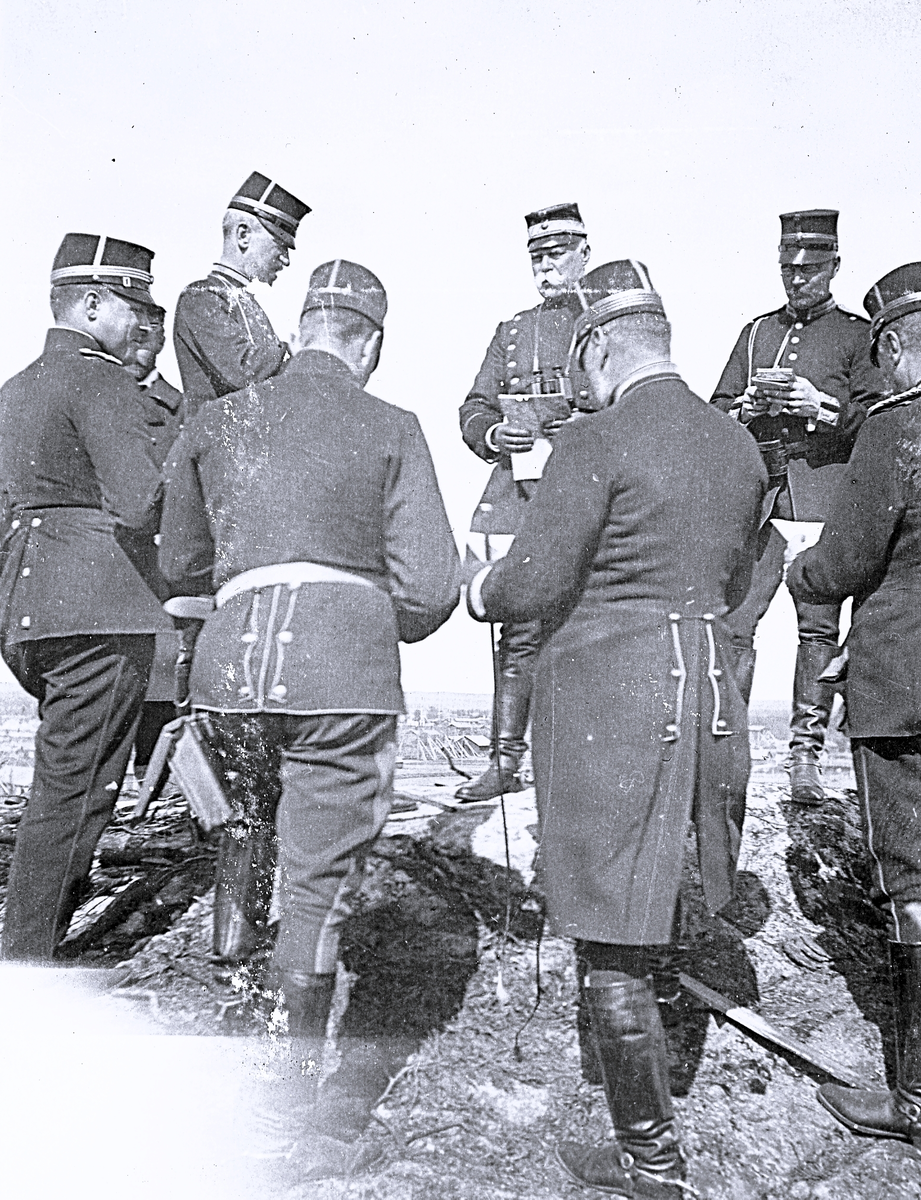 Foto av soldater som står och samtalar vid någon fältövning. Text i album: "Fr v. Wigert, af Ugglas, Sundin, Lilliehöök, Warberg, Janson, Petré och Gardtman".