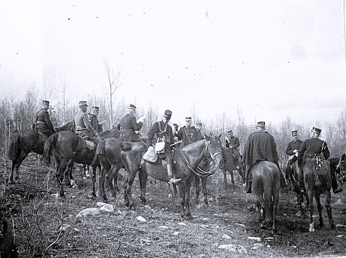 Foto av en grupp militärer till häst vid fältövningar. Text i album: "Fr v. Rutberg, Svedelius, Lindskog, Rosenblad, Säfvenberg, Warberg, Blüm, Marks, Gråå, Petré och Sandberg".
