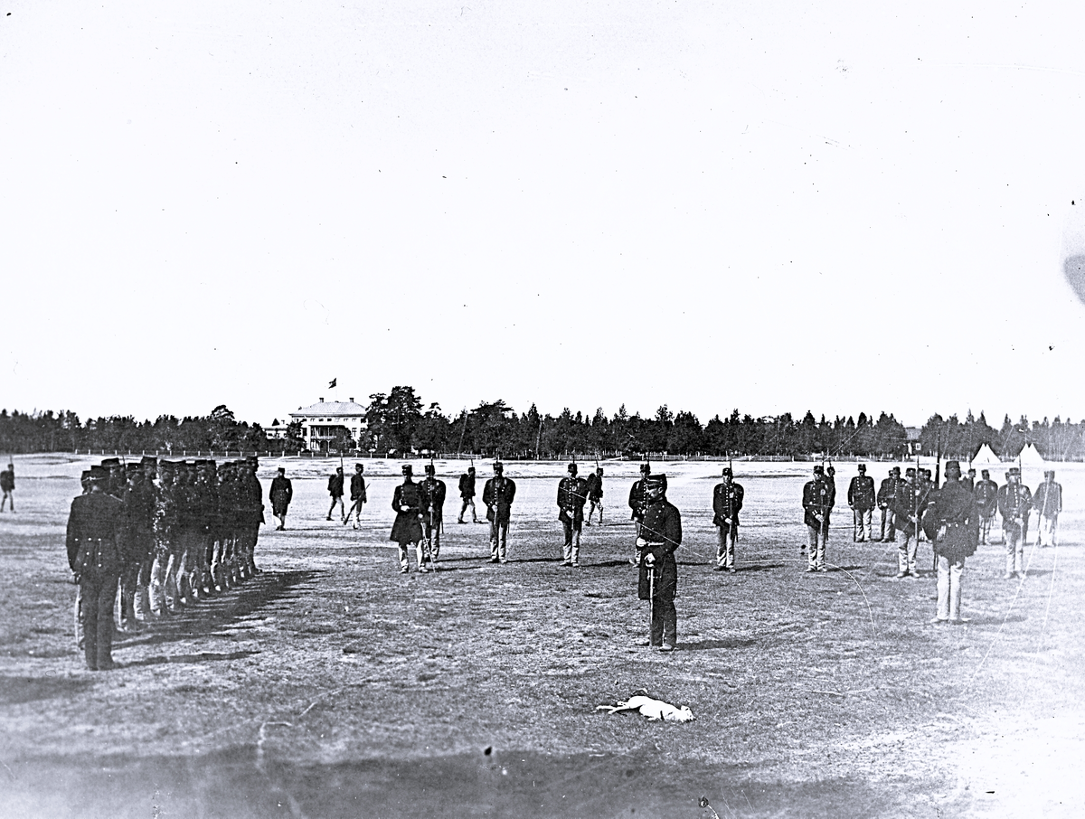 Foto av miltärövningar för soldater som utförs vid Mohed, Söderhamn, Hälsingland, en liten hund ligger och vilar mitt i bild, 1893. Text i album: "Nygren och Trönnberg", troligen officerare.