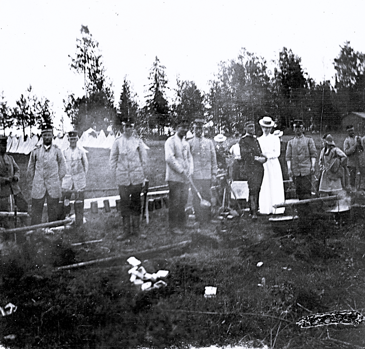 Foto av bivacken vid Mårdnäs beväringsrekrytskolan med både män och kvinnor, det ser ut som dom ska laga mat till beväringarna, 1901