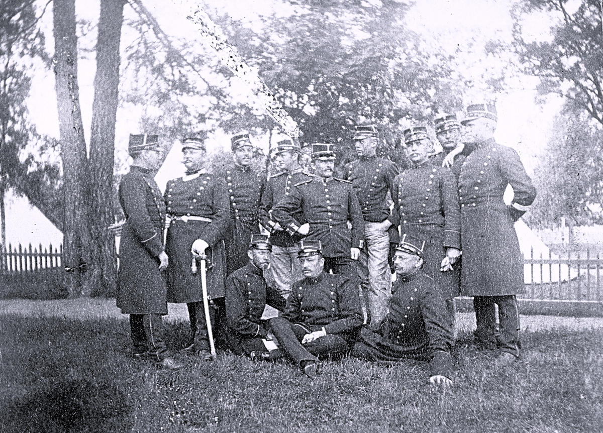 Foto av en grupp underlöjtnanter, 1892. Text i album: "Fr v. Swedlund, Stein, Sundberg, Säfvenberg, Genberg, Söderhielm, Schöning, Dahl, Lilliehöök, sittande Carlén, Sandelin och Södersten".