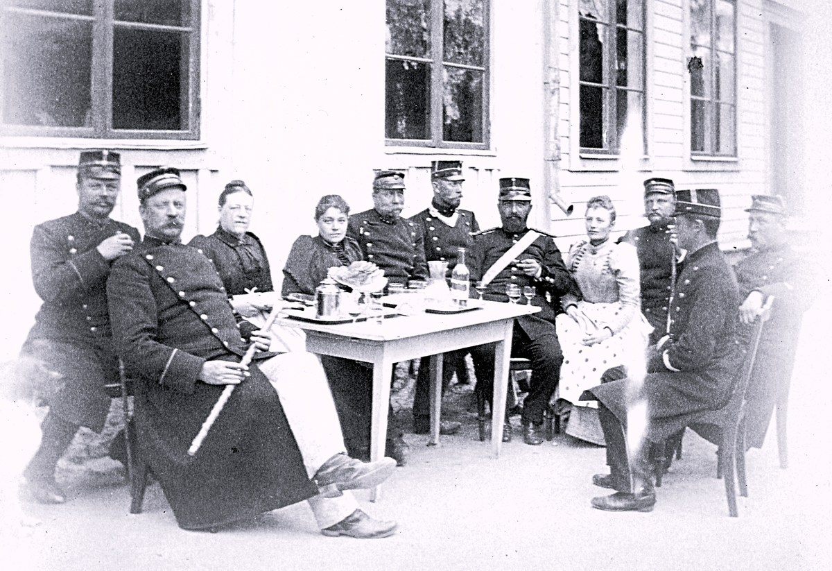 Titel: Foto av ett gäng män i uniform samt några kvinnor som sitter vid ett bord ute på en gård. Text i album: "Eftermöte 1892. Fr v. von Hedenberg, Schultz, fru Schultz, fru Gille, Wahlberg, Carlén, Gille, fru Stein, Säfvenberg och Söderberg".