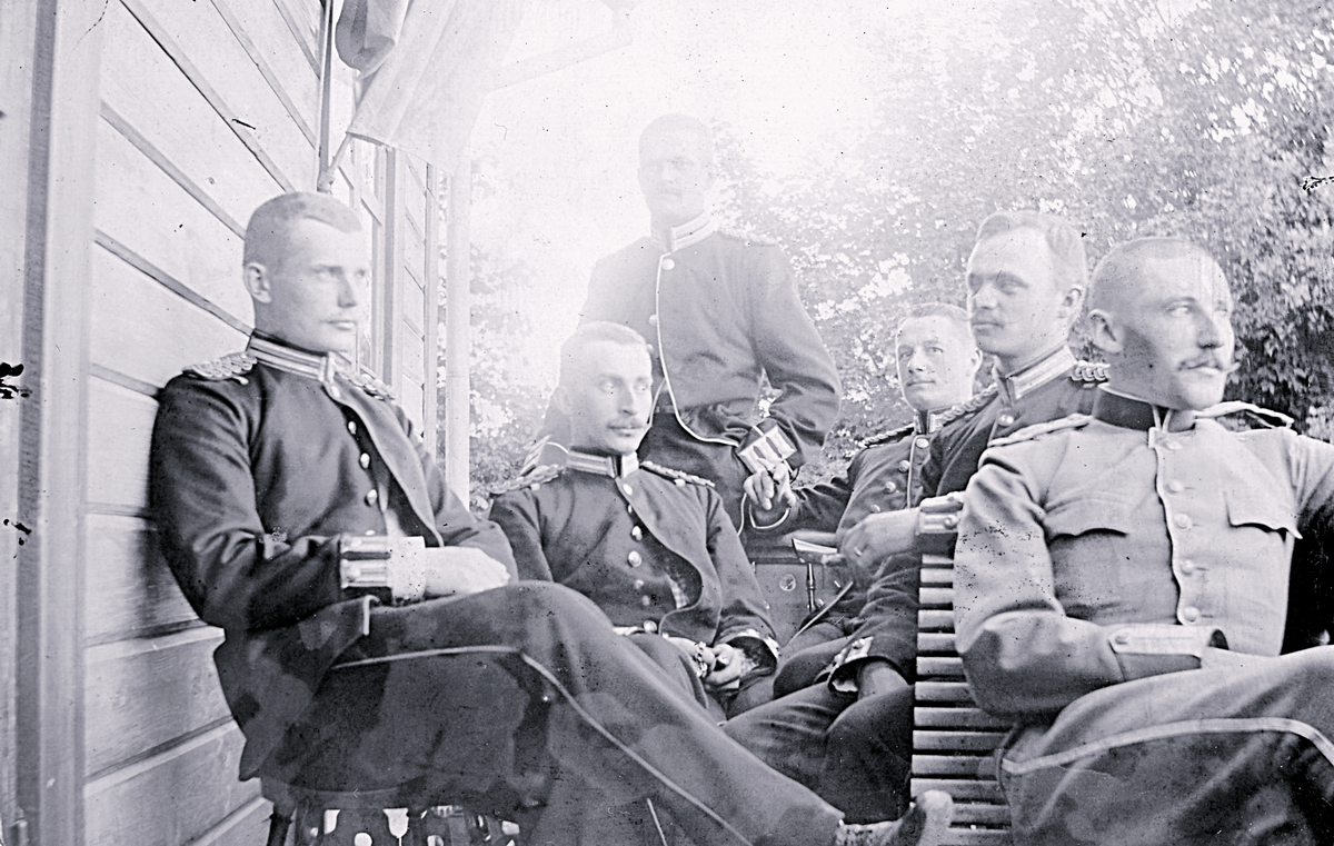 Foto av en grupp män i uniformer som sitter utomhus och i bakgrunden syns vegetation. Text i album: "Fr v. Grafström, Ulfsparre, Bergsten, Säfvenberg, Kreuger och af Sandeberg".