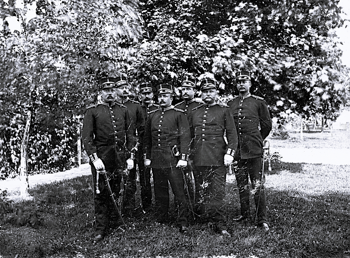 Titel: Foto av en grupp löjtnanter. 2.kl. Text i album: Fr v. Runer, ? , Pihlström, Genberg, Sandelin, Stein och Dahl.