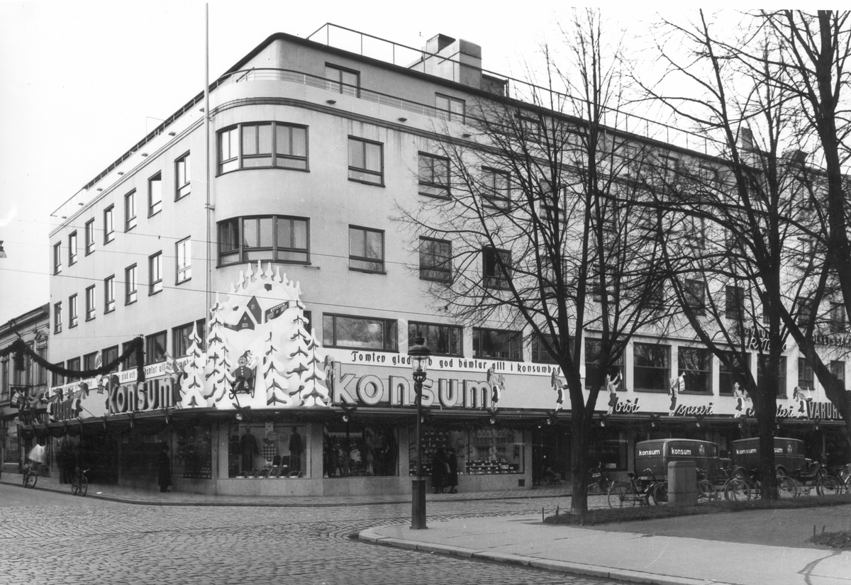 Varuhuset Konsum Alfa, i hörnet Norra Kungsgatan och Drottninggatan, Gävle, med juldekoration.