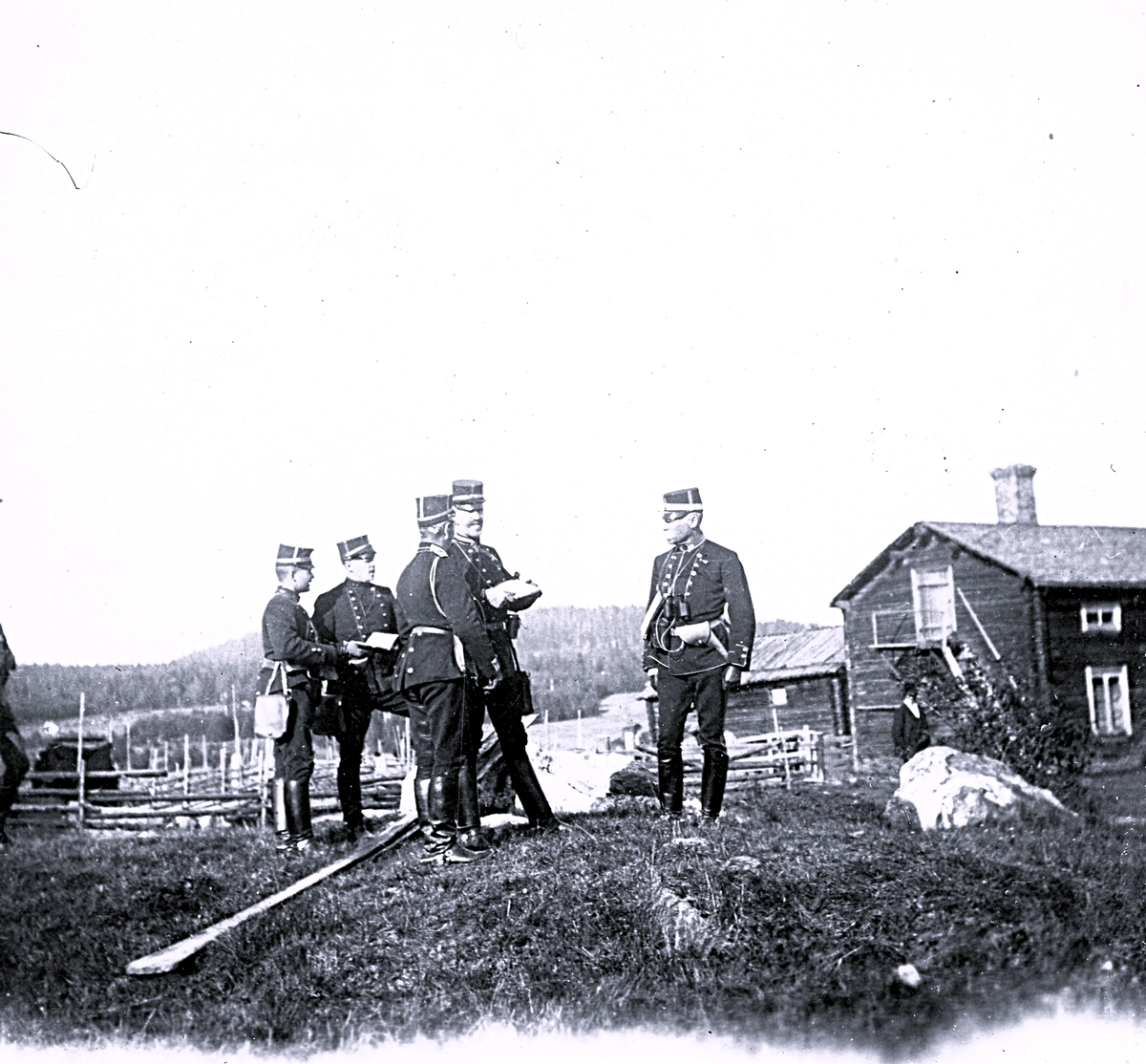 Foto av militärer poserande framför en stuga med träd och gärdsgård i bakgrunden. Text i album: "Fr v. Marks, Lilliehöök, G, Petré, Sundin och Warberg".