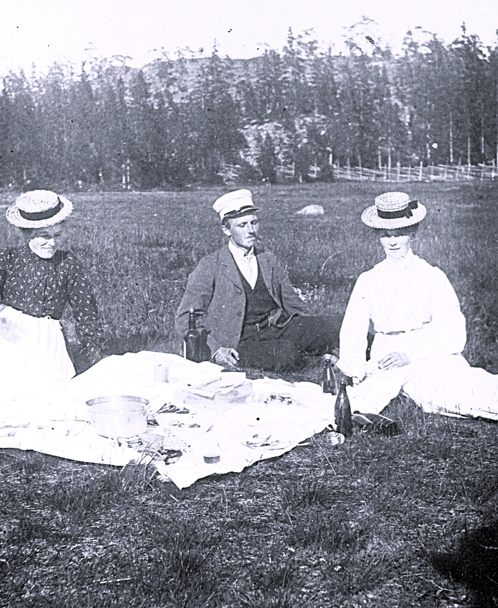 Foto av tre personer som har picknick på ute i det gröna. I bakgrunden syns skog och en gärdsgård.