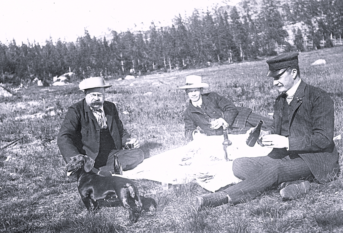 Foto av tre män som har en picknick i det gröna med en hund som sällskap, i bakgrunden syns ett skogsområde.