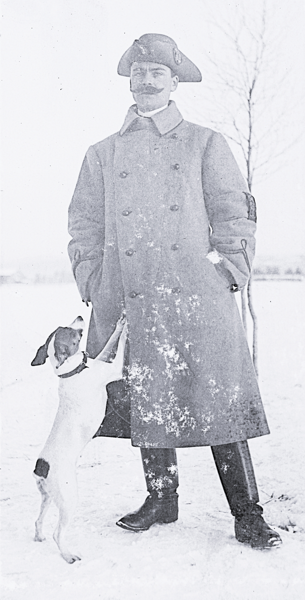 Foto av en soldat med militärkläder och en hund som vill hälsa.