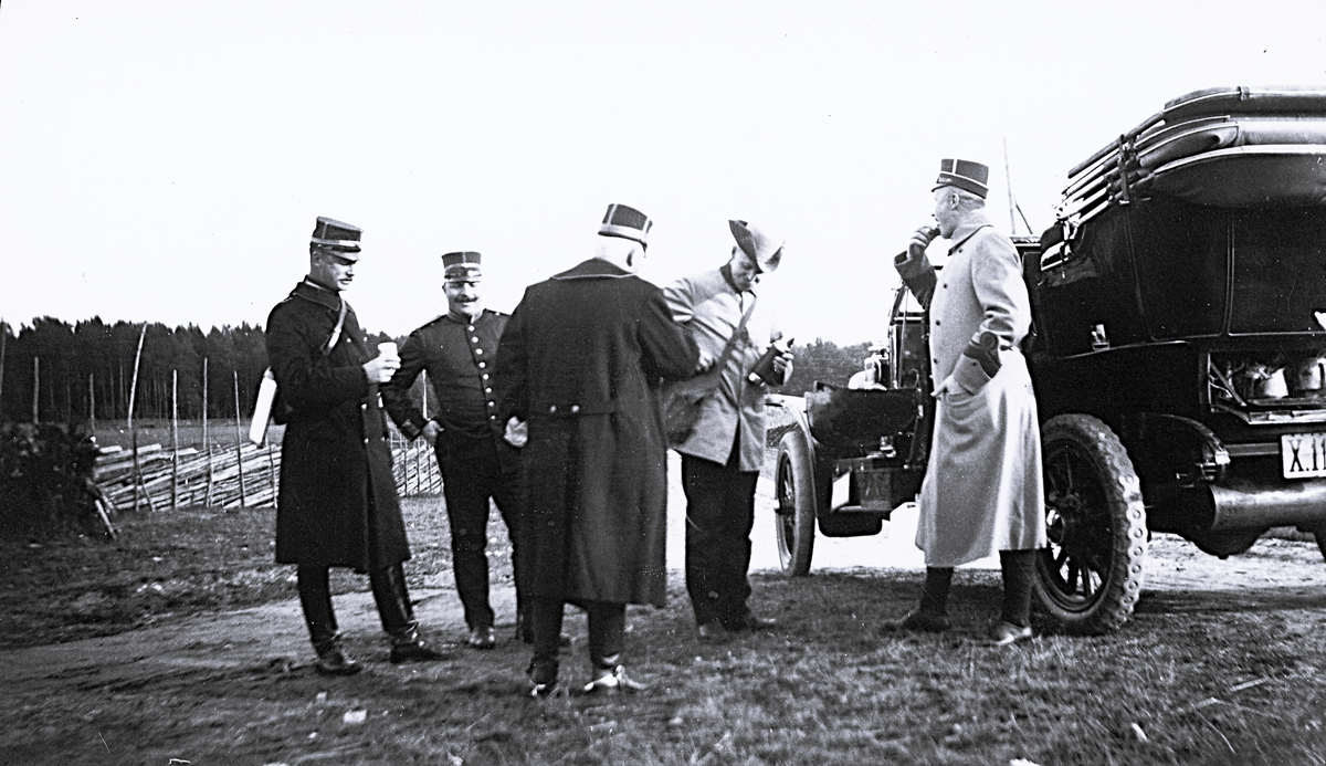 Foto av en grupp militärer ute på uppdrag, i bakgrunden syns skog, ängsmark och gärdsgård samt en bil till höger i bild. Text baksida kort: "Landstormsbefälhavarna 1910 (oktober) inom Gäfle l.o. Från vänster: Kapten Säfvenberg, Löjtnant Härdelin, Öfv-löjtnant Rettig, Kamrer Säfvenberg och Löjtnant Holmström".