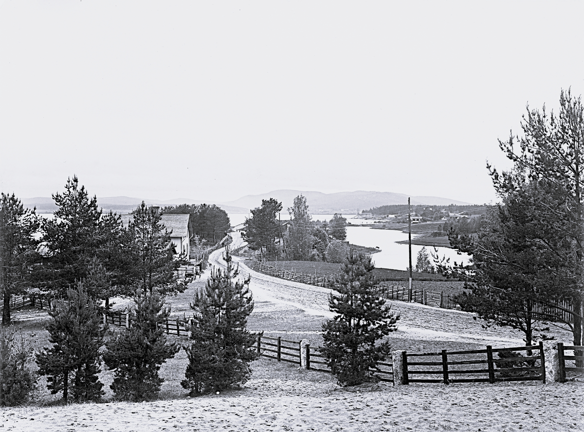 Titel: Foto av en väg som går genom ett landskap med berg och sjö samt en del byggnader i bakgrunden och barrträd i förgrunden.