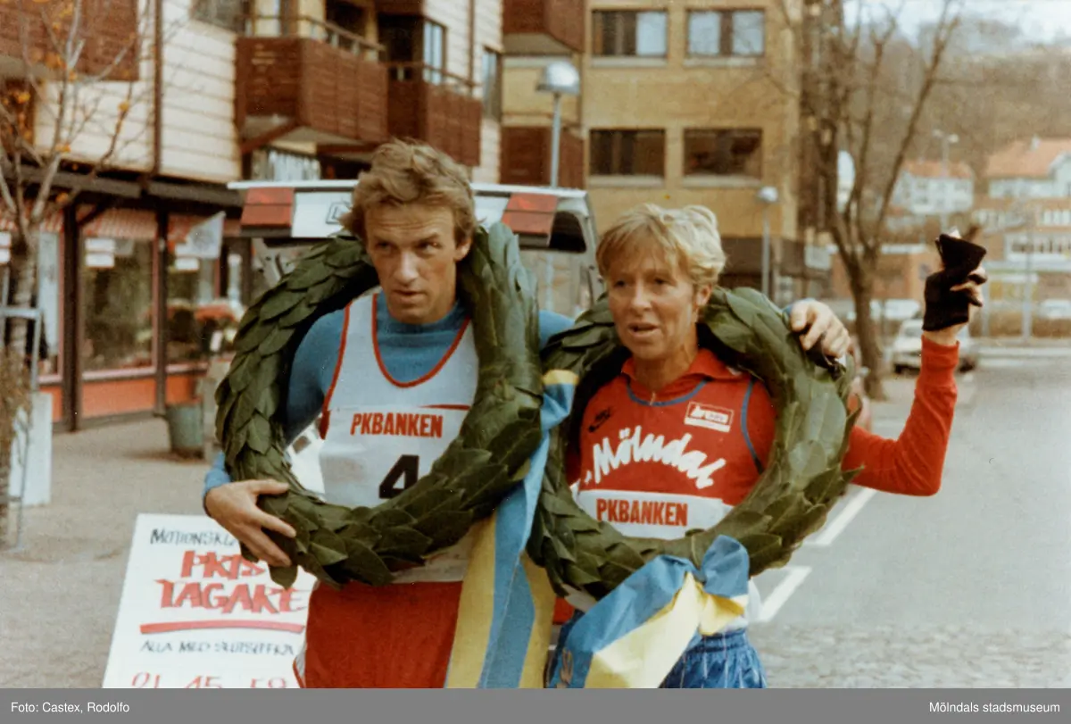 Motionsloppet i löpning Mölndalsbroloppet i oktober 1985. Segrarna i dam- respektive herrklassen ses här vid Bergmansgatan. Kvinnan är Evy Palm från Mölndals AIK