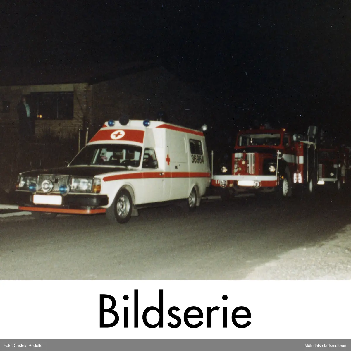Serie om tre fotografier som visar brandkåren på utryckning vid Höjdgatan i Mölndal i april 1983.