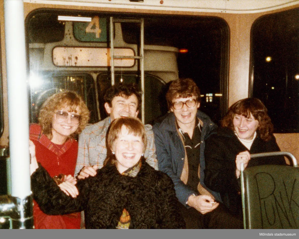 Grupporträtt på 4:ans spårvagn i december 1982. Rodolfo Castex ses i bakre raden, tvåa från vänster. Linjen trafikerade sträckan Mölndal - Saltholmen.