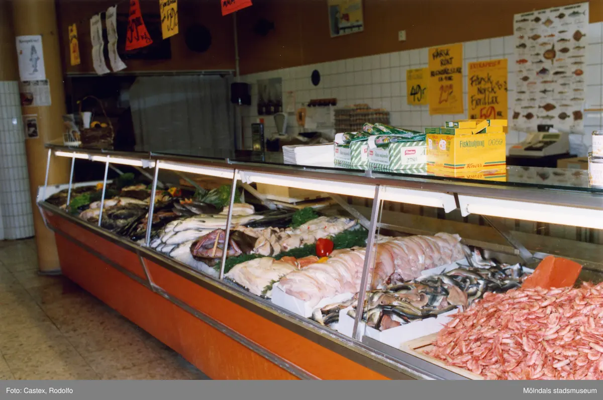 Fiskaffären i Mölndals centrum den 10 maj 1991. Fiskdisken full med fisk och skaldjur.